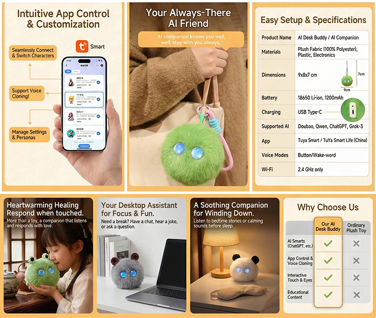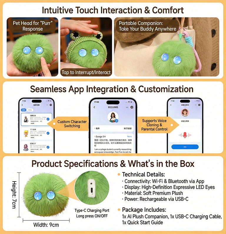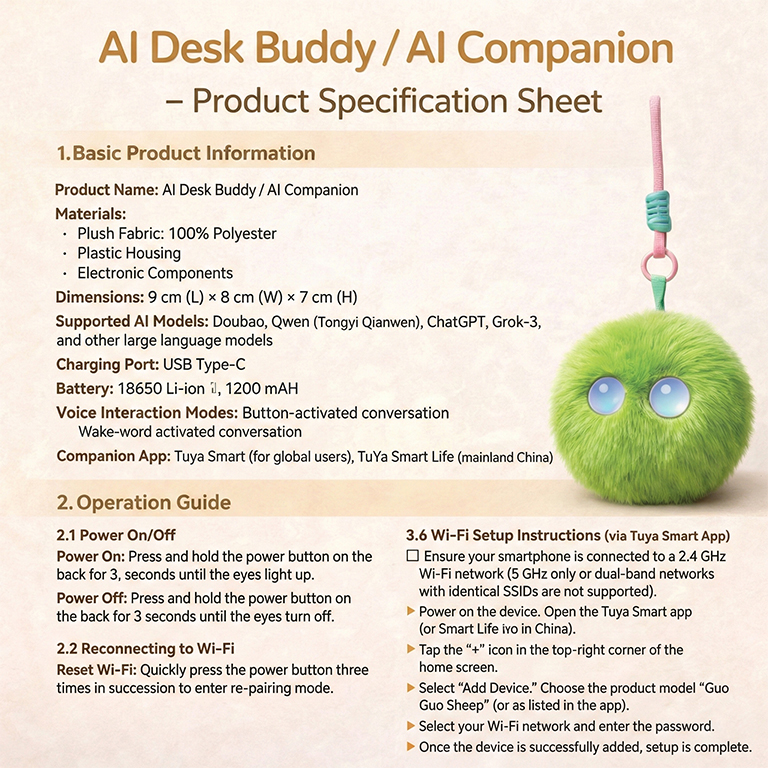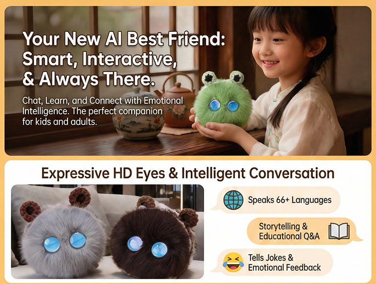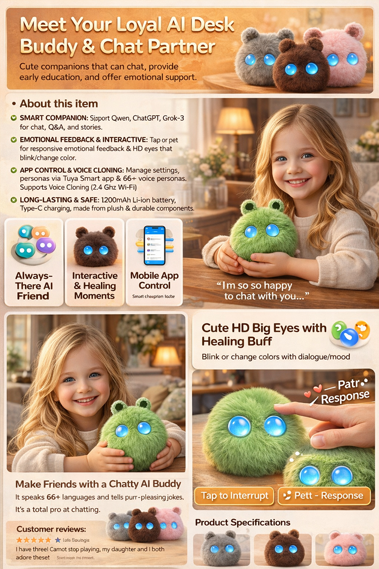 It’s a cute and comforting pet that combines encyclopedia Q&A, storytelling, jokes, and emotional companionship; it supports both voice activation and button-press triggering, making it a versatile companion and a perfect desktop stress-reliever.